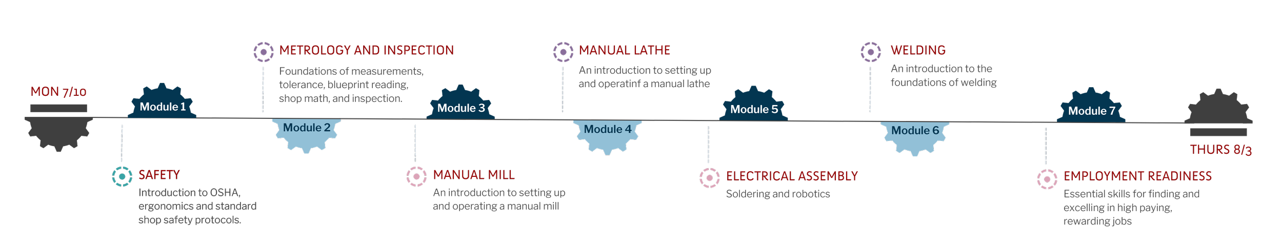 This 4 week course will consist of six modules. Students will cover safety, metrology, electrical assembly, welding and employment skills and readiness. Enrollment in this course is conditional upon ability to attend first two weeks (safety training). Please note that this is an introductory course that will not result in certification upon completion.